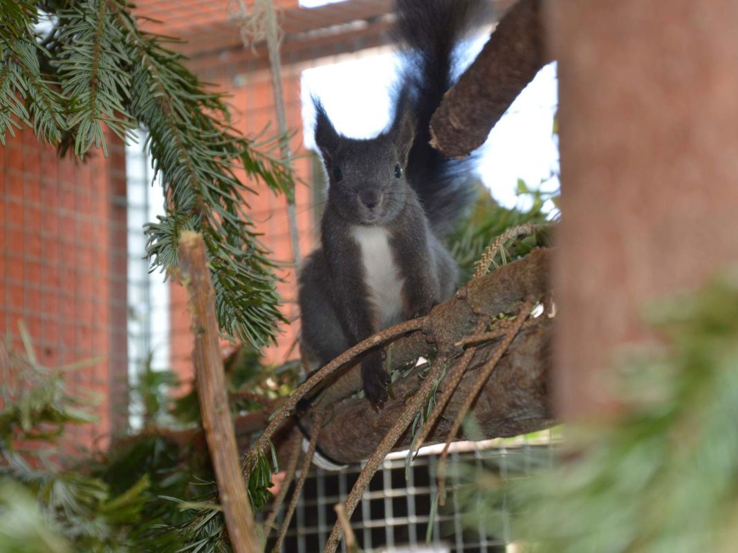Das Gehege ist naturnah gestaltet: mit Tannen, Baumstämmen, Schlafhäuschen und vielen Beschäftigungsmöglichkeiten. Regelmässig hängen wir frische Äste von Laub- und Nadelbäumen hinein und entfernen verdorrte Äste, damit die Eichhörnchen immer eine naturnahe und abwechslungsreiche Umgebung haben.