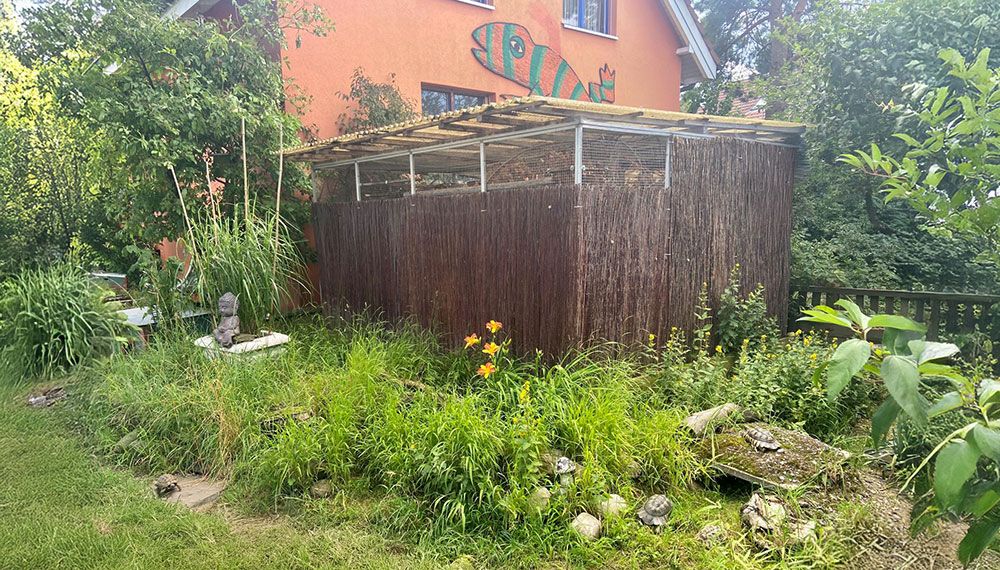 Die Aussenvoliere ist 35 m3 gross und befindet sich direkt im Garten neben dem Wohnhaus.